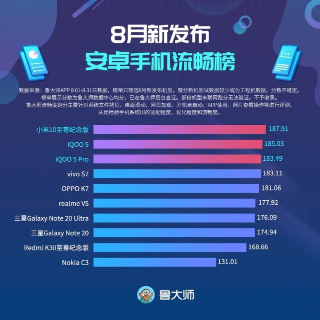 9月2日,鲁大师公布了8月安卓新机流畅度排行榜,该榜单从8月发布的新机中进行筛选评比,评比项目包含系统文件拷贝、桌面滑动、网页加载、开机自启动、APP使用、照片查看等操作,从手机不同纬度检验手机系统UI的适配程度、优化程度与流畅度。
