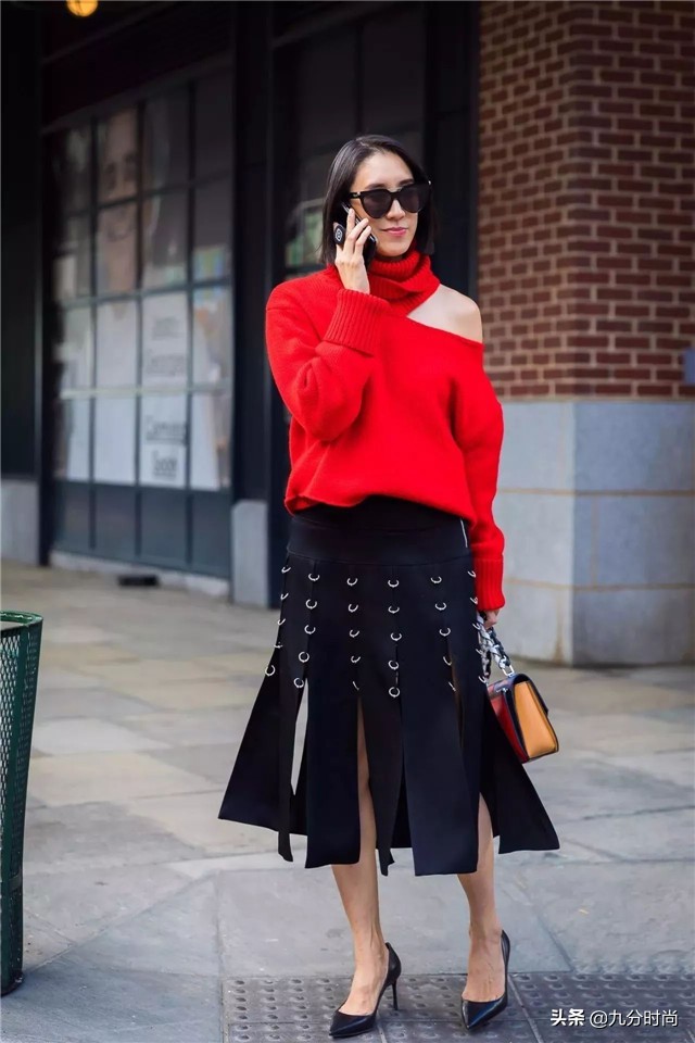 在选择毛衣的时候,不要总是拘束于黑色和白色,偶尔利用一些亮色系的毛衣,绝对能够让你的魅力得到提升,像那些亮色系的毛衣,最重要的就是为了降低毛衣的厚重感,提亮整体造型,并修饰肤色,例如下面这一件红色的毛衣,颜色饱和度就很高,然而却并不俗气,搭配起来,反倒是能够彰显出强大的气场。